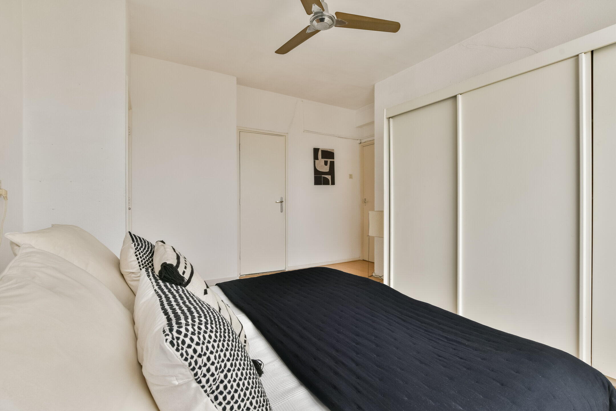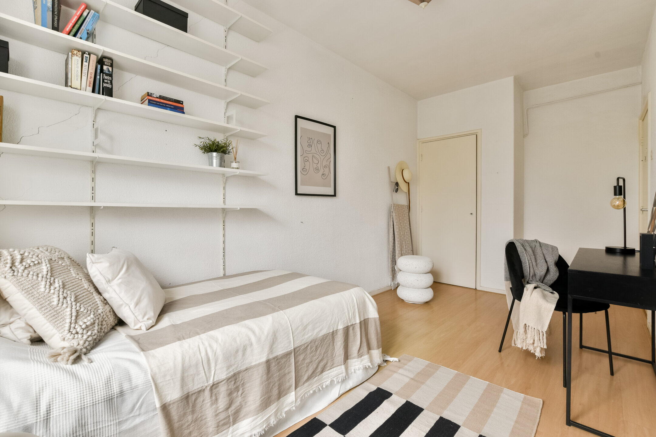 De tweede slaapkamer ligt, net als de woonkamer, aan de westzijde en is eveneens voorzien van een vaste kast en een wastafel.