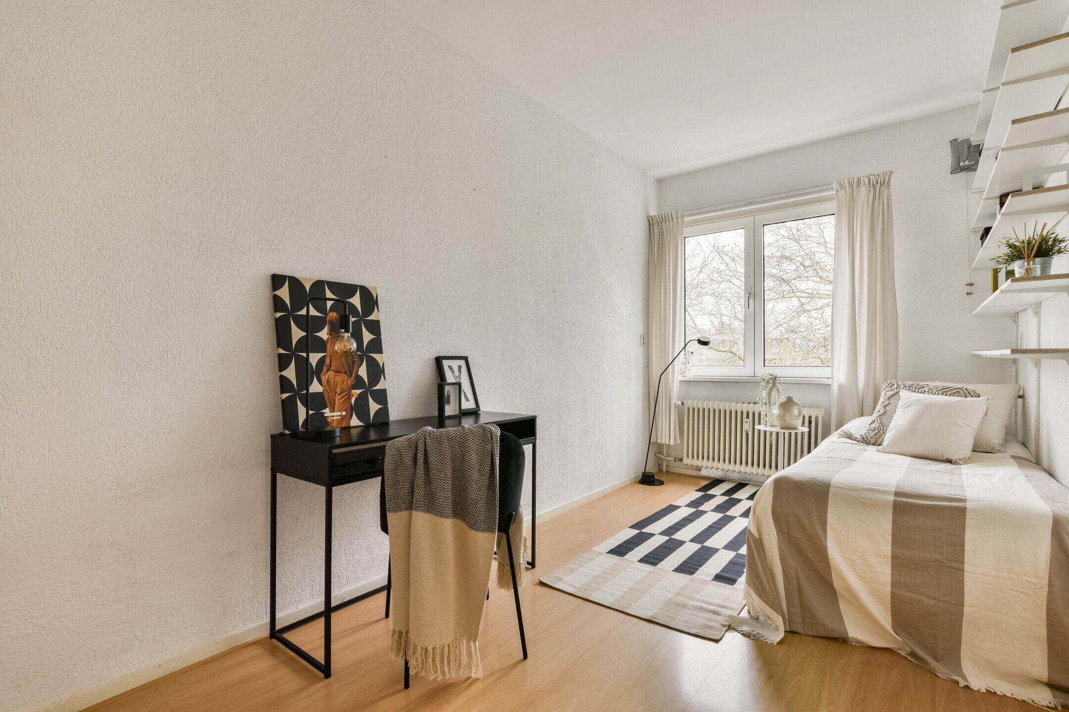 De woonkamer is royaal en licht, met grote ramen en toegang tot het balkon op het westen, waar je geniet van de middag- en avondzon. De ruimte is verdeeld in een zit- en eetgedeelte en voorzien van vaste kasten.