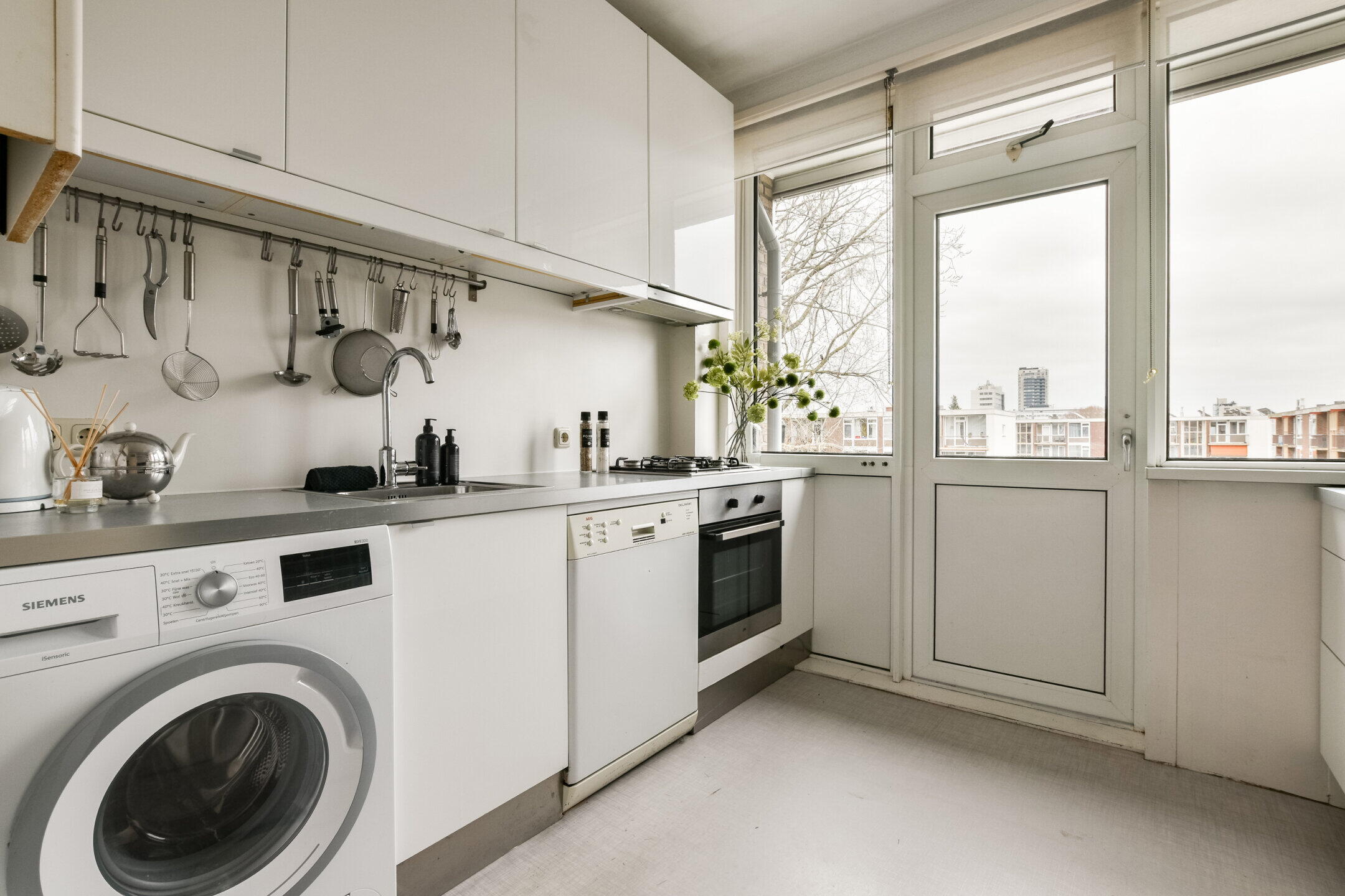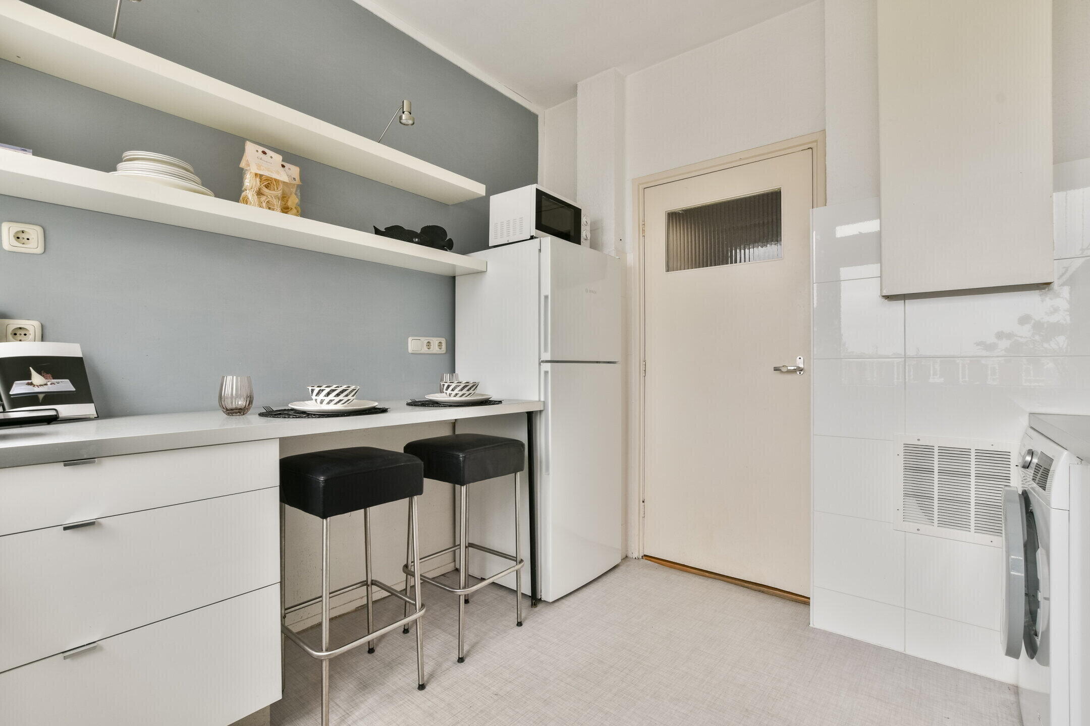 De keuken ligt aan de oostzijde en beschikt over een functioneel keukenblok met onder- en bovenkasten, spoelbak, afzuigkap en ruimte voor losse apparatuur. Hier bevindt zich tevens de aansluiting voor de wasmachine. Vanuit de keuken heb je toegang tot het tweede balkon, gelegen op het oosten, waar je in de ochtendzon heerlijk kunt ontbijten.